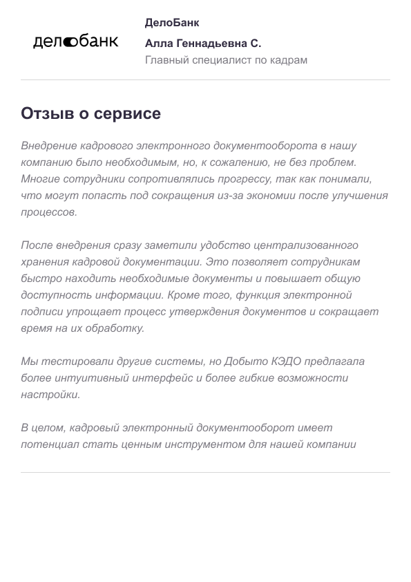 За время использования сервиса не было утеряно ни одного кадрового документа.