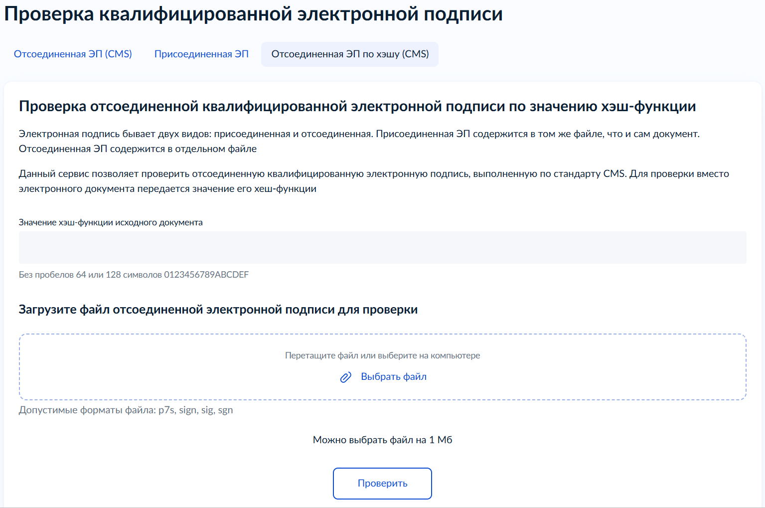 Сервис проверки ЭП на портале Госуслуг — самый простой вариант для разовых проверок. Регистрация не требуется. Загружаете файл документа и файл подписи (для откреплённой) или один файл (для присоединенной), вводите капчу, нажимаете «Проверить». Сервис покажет статус подписи и данные о владельце сертификата. Нюанс: Госуслуги проверяют только квалифицированные подписи — если сертификат выпущен неаккредитованным УЦ, проверка не пройдет.