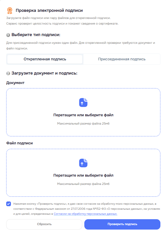 - Шаг 3. Загрузите файлы. Для откреплённой подписи — документ и файл подписи (каждый до 25 МБ). Для присоединённой — один файл. Перетащите файлы в область загрузки или выберите вручную.
