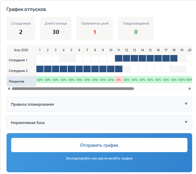 - Шаг 5. После ввода всех данных нажмите кнопку «Построить график» — система мгновенно создаст визуализацию с календарной сеткой, цветовой индикацией отпусков каждого сотрудника и строкой покрытия показывающей процент присутствующих на каждый день.